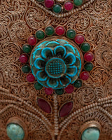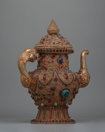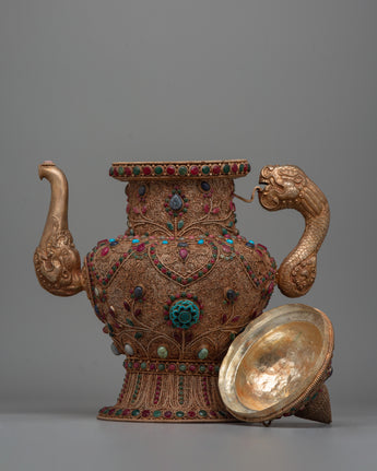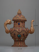 This Handmade Tibetan Tea Pot is a stunning work of art, made of copper and plated in electro gold and silver. This tea pot, measuring 40 cm in height and 22 cm in diameter and weighing 3.09 kg, is a significant work that embodies the beauty and spirituality of Tibetan handicraft. The delicate inlay of auris ruby, panna, and filigree work provides brilliant colors and profound symbolic value, since these precious stones have long been associated with healing, protection, and wisdom.