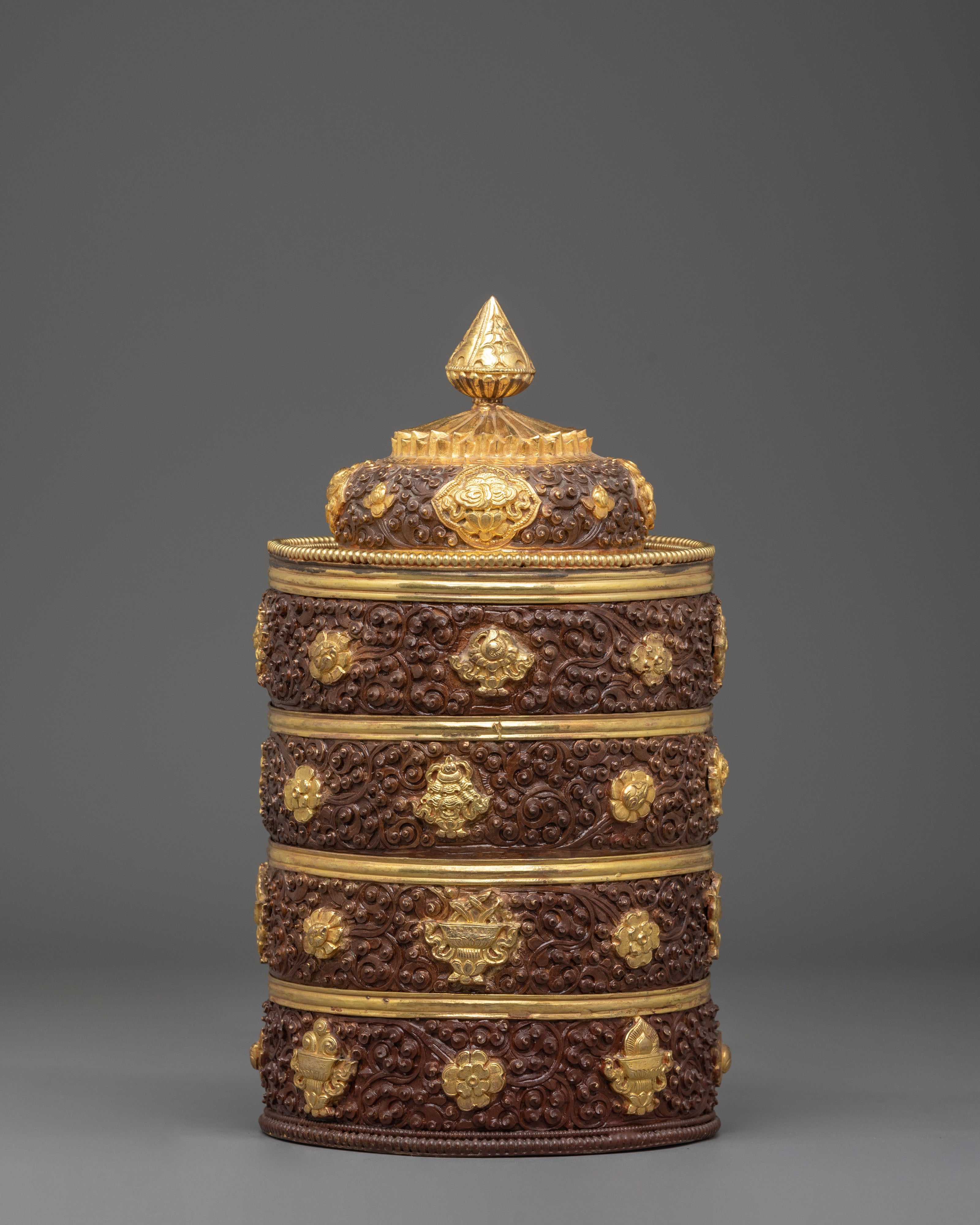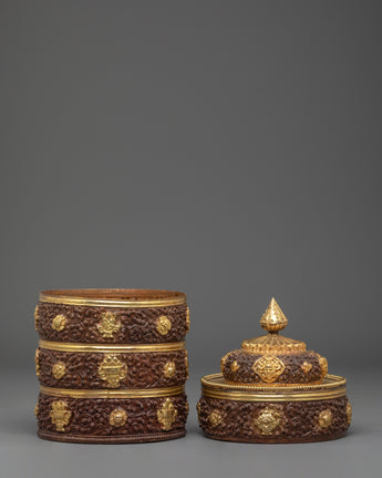The carved motifs on the rice pot showcase traditional patterns, each symbolizing prosperity and cultural significance. Intricate floral designs and elegant detailing wrap around the pot, underscoring the level of expertise that went into its creation. The gold-plated accents elevate the elaborate carvings, making this rice pot a statement piece of art and a symbol of Indian craftsmanship. This piece is not just a container, but a work of decorative art that speaks to the legacy of craftsmanship passed down through generations.
