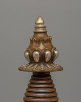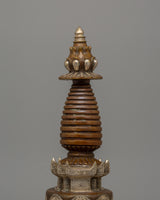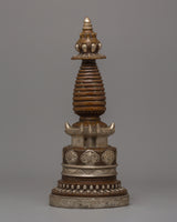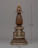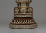 This Handmade traditional Kadampa Stupa, a historic Buddhist symbol of enlightenment and spiritual wisdom, will add beauty to your sacred place. This masterpiece, which measures 33.5 cm in height and 14 cm in width, is made of oxidized copper intricately plated in silver. Respected as holy Buddhist monuments, stupas symbolize the Buddha's mind and are strong spiritual sites for reflection, prayer, and meditation.
