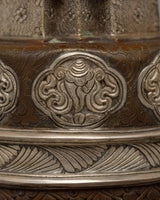 This stupa, which weighs 2.12 kg, is a masterpiece of craftsmanship. Its intricate carvings and elegant design combine classic Tibetan aesthetics with strong components. The silver plating highlights its heavenly elegance, while the copper body provides strength and an aged charm. This stupa is suitable as the focal point of any altar or shrine. This precious item provides your area with inspiration, harmony, and serenity, regardless of whether you are an art aficionado or a spiritual practitioner. It also provides an honest offering for loved ones who are looking for spiritual growth.