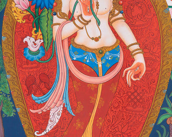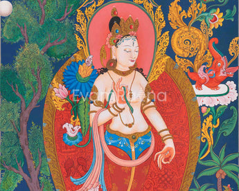 The Handpainted Goddess White Tara Thangka is a masterpiece of divine artistry, capturing the compassionate essence of the revered deity White Tara in exquisite detail. With each stroke of the brush, the image of White Tara comes to life on the canvas, radiating with serenity, grace, and healing energy. Adorned with vibrant colors and intricate patterns, the Thangka depicts White Tara in her resplendent form, seated gracefully on a lotus throne, with one hand extended in a gesture of granting blessings and the other holding a blooming lotus flower symbolizing purity and enlightenment. Her gentle countenance exudes compassion and wisdom, offering solace and guidance to all who gaze upon her sacred image. Devotees of White Tara turn to this Handpainted Thangka as a source of inspiration, empowerment, and spiritual nourishment, seeking her divine blessings for healing, longevity, and enlightenment on their journey towards awakening. As a symbol of divine grace and compassion, the Handpainted Goddess White Tara Thangka serves as a powerful reminder of the inherent potential for inner transformation and liberation within all beings.