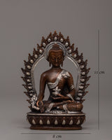 The Healing Deity Medicine Buddha Statue is copper and has a silver-polished finish. It measures 11 cm tall and 8 cm wide. This 0.21 kg statue depicts the Medicine Buddha, a Buddhist figure revered for his ability to heal physical, mental, and spiritual ailments.
