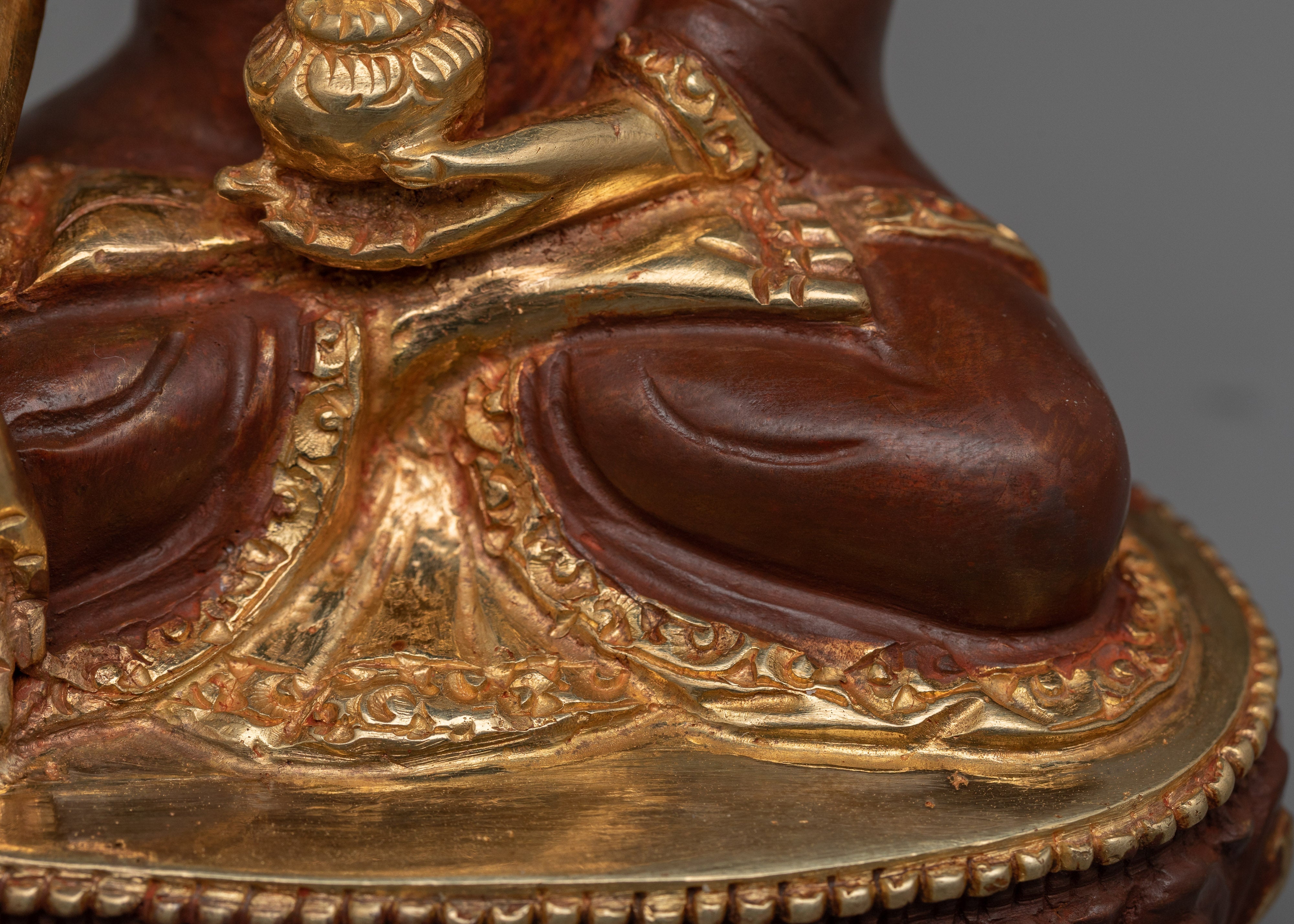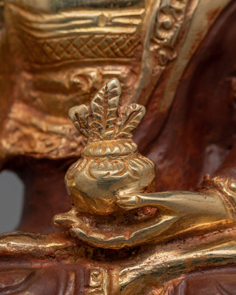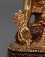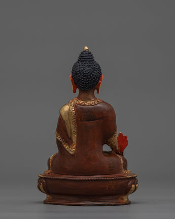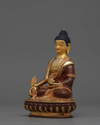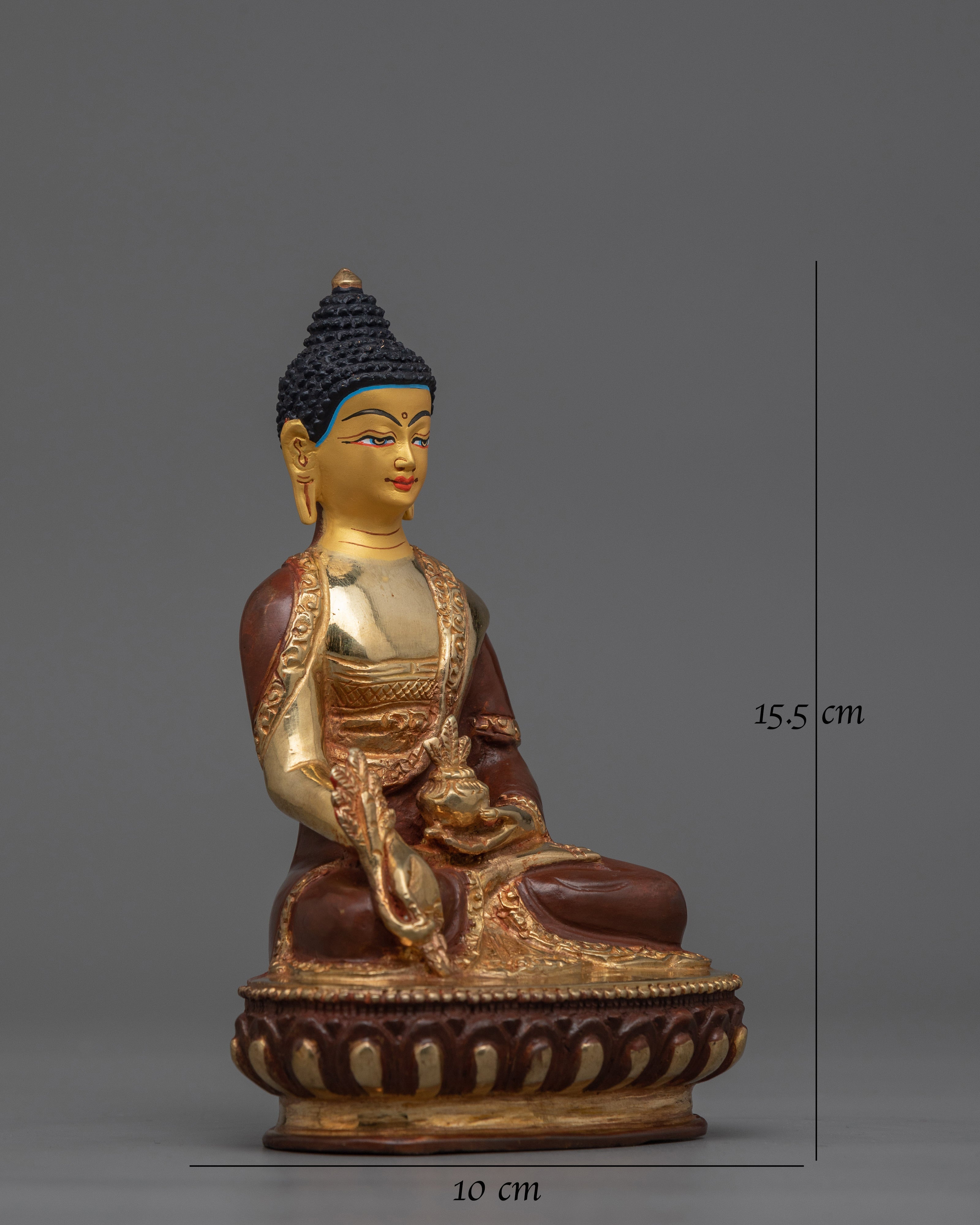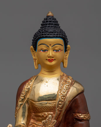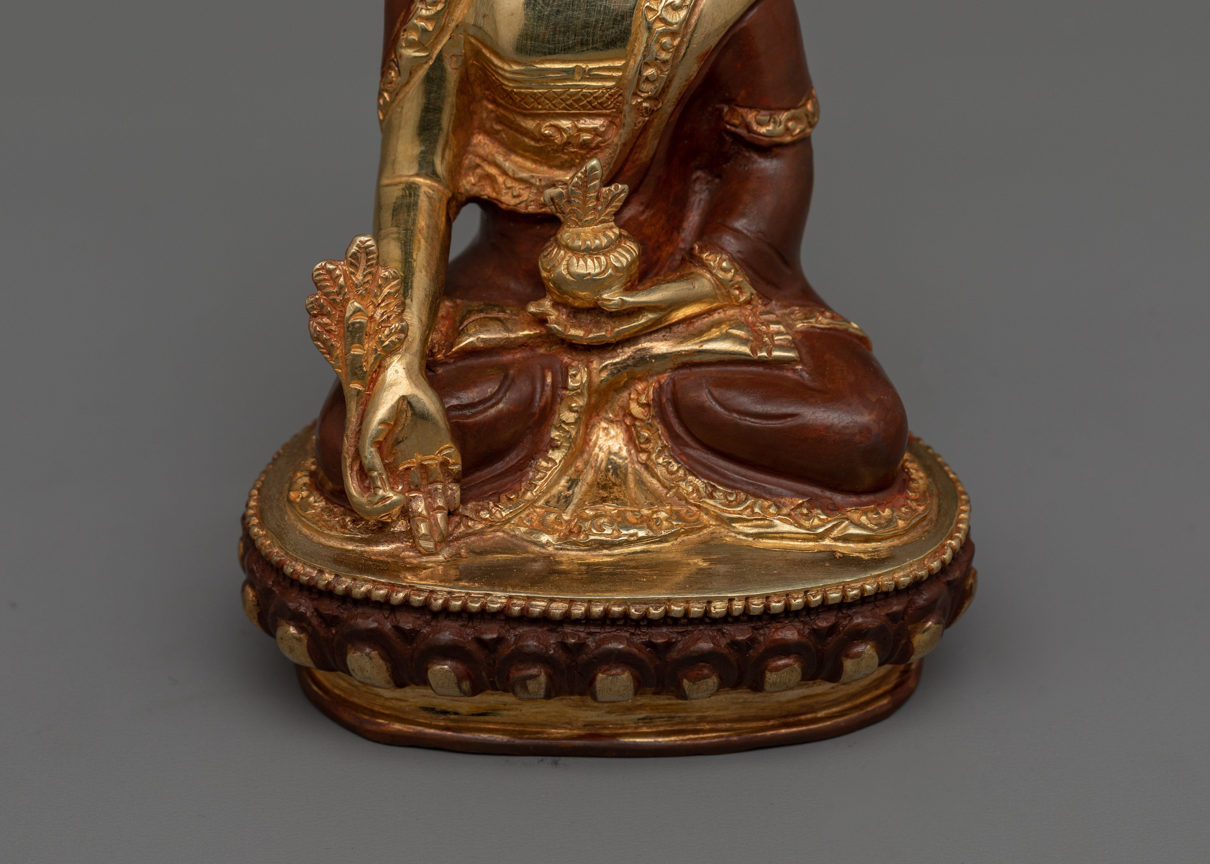 This handcrafted Healing God Medicine Buddha statue, made from pure copper with 24K gold gilded, embodies the Buddha of Healing and Medicine in Mahayana and Vajrayana Buddhism. This Statue is sitting at Size 6.1”/15.5cm (Height) x 3.9”/10cm (Base) Weight: 0.76 kg. This statue has an oxidized body too. Crafted by expert Nepalese artisans, this sacred item embodies the rich traditions of Himalayan Buddhism, making it an important addition to altars, meditation areas, or sacred collections.