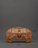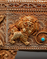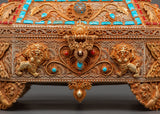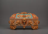 Every box surface is embellished with elaborate filigree work—delicate metal threads twisted and attached into stunning floral and geometric designs. The top highlighted gemstone borders are turquoise and coral, representing wisdom, healing, and spiritual protection. Four lion heads adorn the base, indicating strength and security, while decorated legs elevate the piece like a sacred altar. This treasure box is more than a helpful item; it's a powerful decorative element coated with cultural significance and spiritual force.