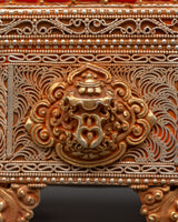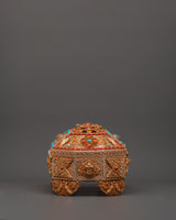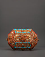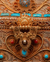 This elegant Himalayan Box with Filigree Work is an incredible representation of Himalayan sacred art, mixing spiritual symbolism with artisan skill. It is created from a copper body, beautifully coated in gold and silver, and embellished with Original turquoise and coral stones. This box, traditionally used to store precious goods like relics, writings, or ritual implements, symbolizes protection and adoration.