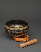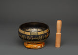 The accompanying wooden stick (13cm x 2.3cm) is designed to strike the bowl, resulting in harmonic vibrations that aid in chakra balance and relaxation. This bowl's delicate design and brass body make it an ideal complement to any meditation shrine or as a one-of-a-kind spiritual treasure. This Tibetan bowl is suitable for daily meditation or sound healing activities and may bring a peaceful, harmonious energy into your room.