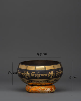 The Himalayan Jambati Singing Bowl is handcrafted from brass and designed for meditation, sound therapy, and spiritual practices. The bowl features sacred mantras and symbols engraved along its surface, amplifying its soothing and healing vibrations when struck. With a height of 7cm (without base) and 9cm (with base), a diameter of 13.5cm, and an inner depth of 6.5cm, this bowl produces a deep, resonant sound ideal for mindfulness and meditation sessions. Weighing 0.73kg, it delivers clear and rich sound, perfect for creating a calming atmosphere.
