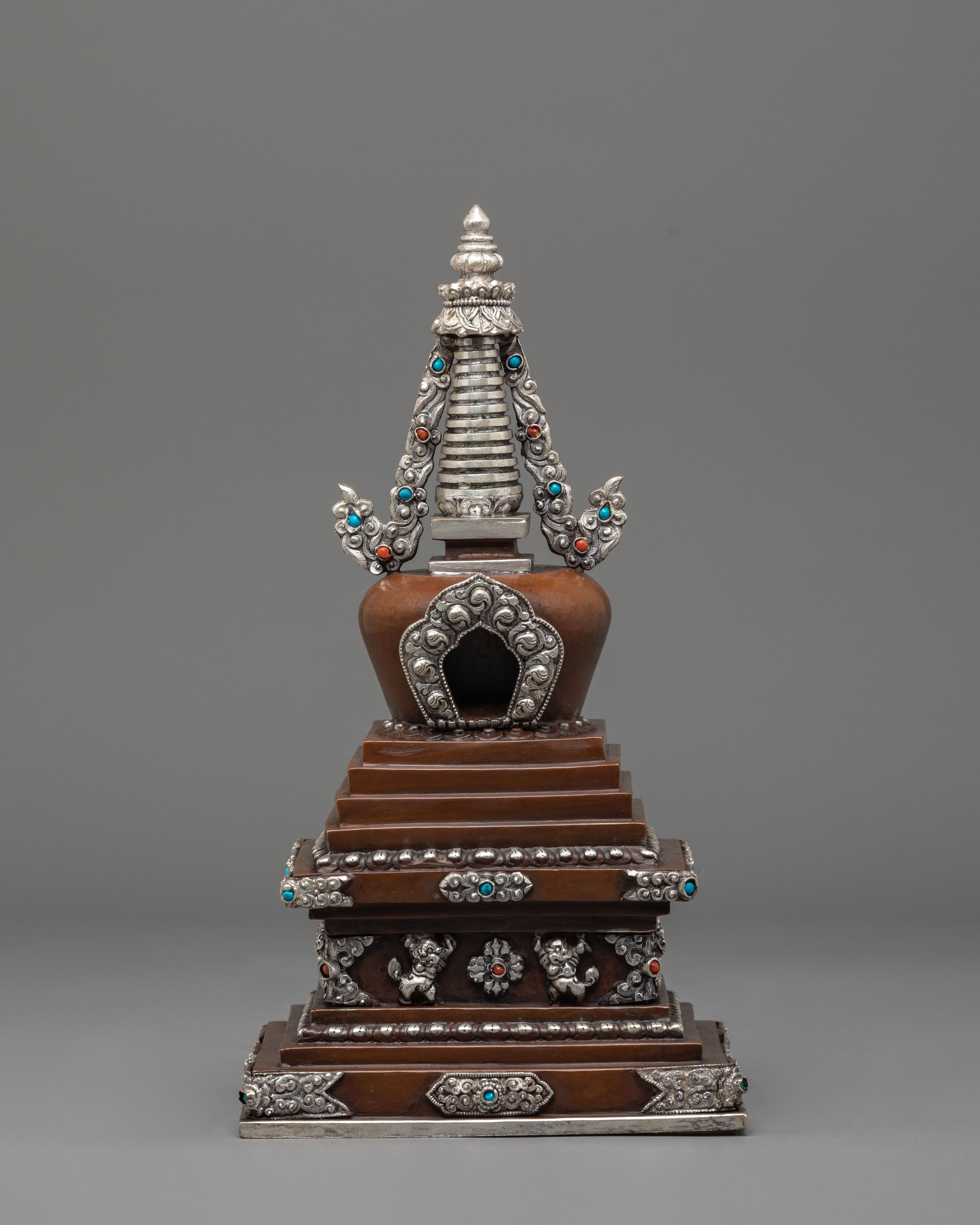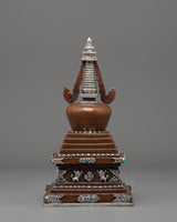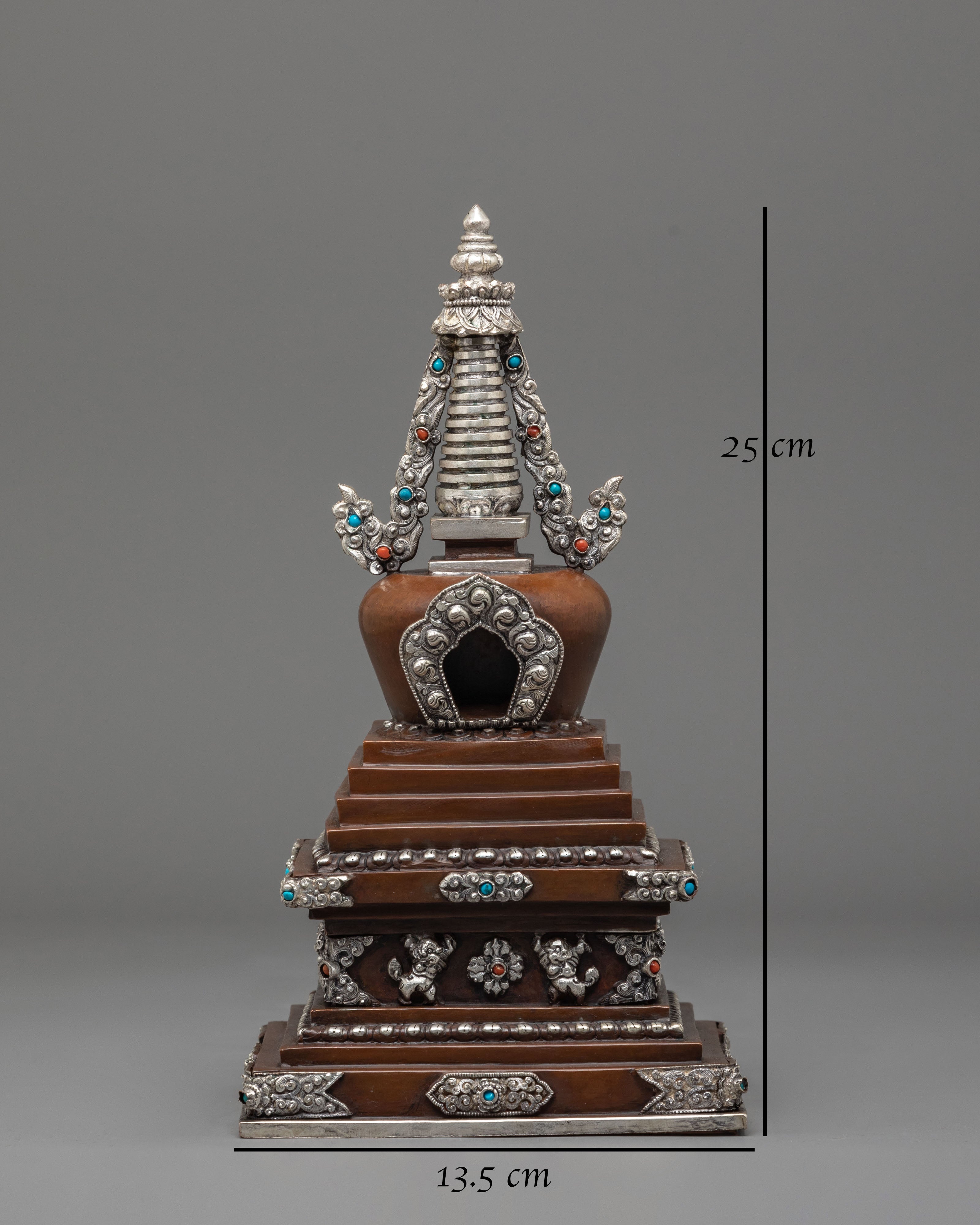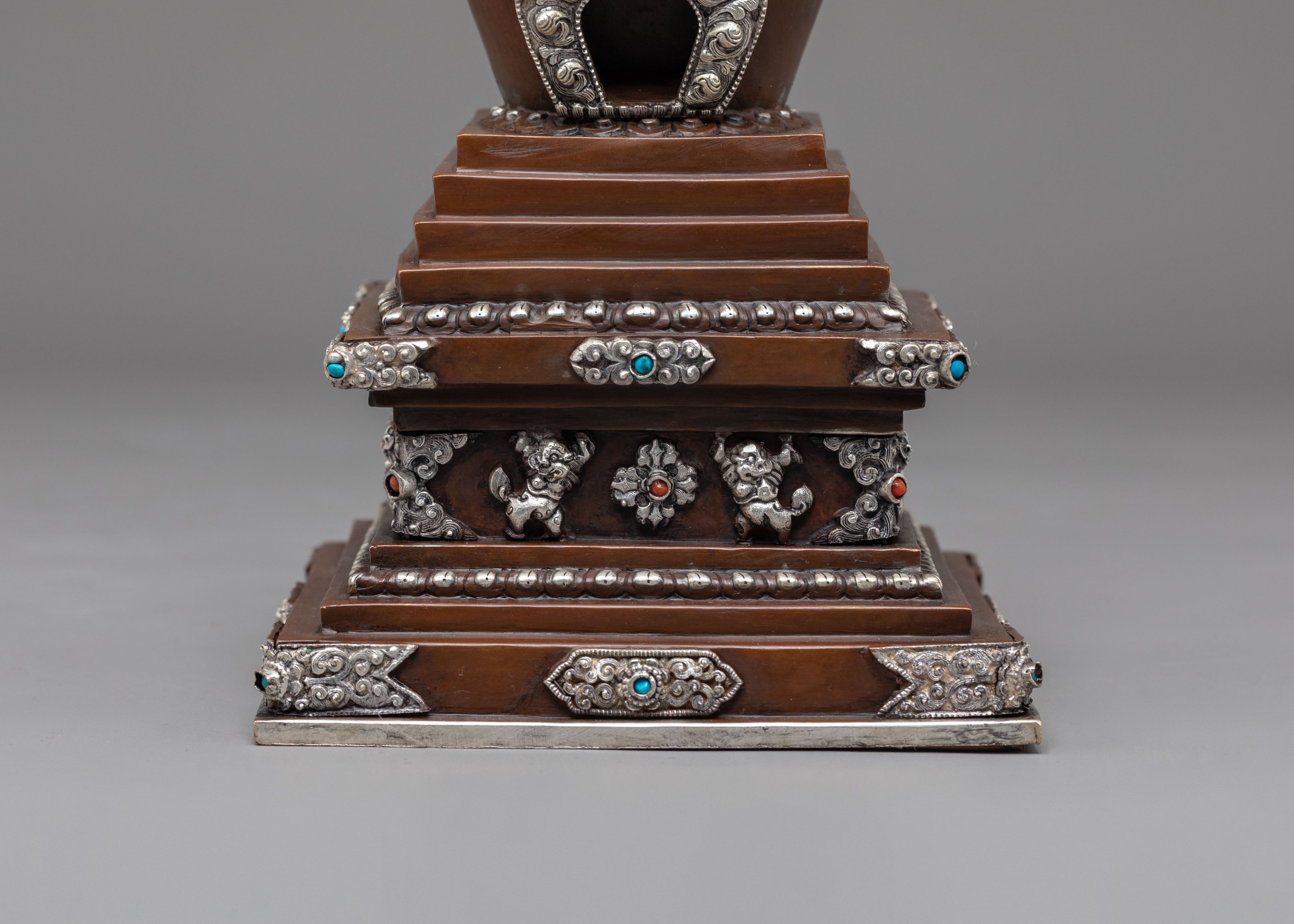 Every aspect of this Oxidized Copper Himalayan Ritual Stupa is imbued with spiritual meaning and expert craftsmanship. The square base symbolizes solidity and the physical world, whilst the dome represents the universe. The spire, which rises upward, represents the connection between human consciousness and enlightenment. The silver-plated accents and turquoise and coral stones highlight its mystical presence, boosting its spiritual vitality. The delicate carvings reveal the passion, expertise, and spiritual depth of traditional Himalayan artists, creating a sculpture that is both beautiful and meaningful.