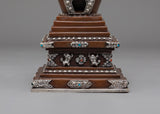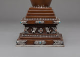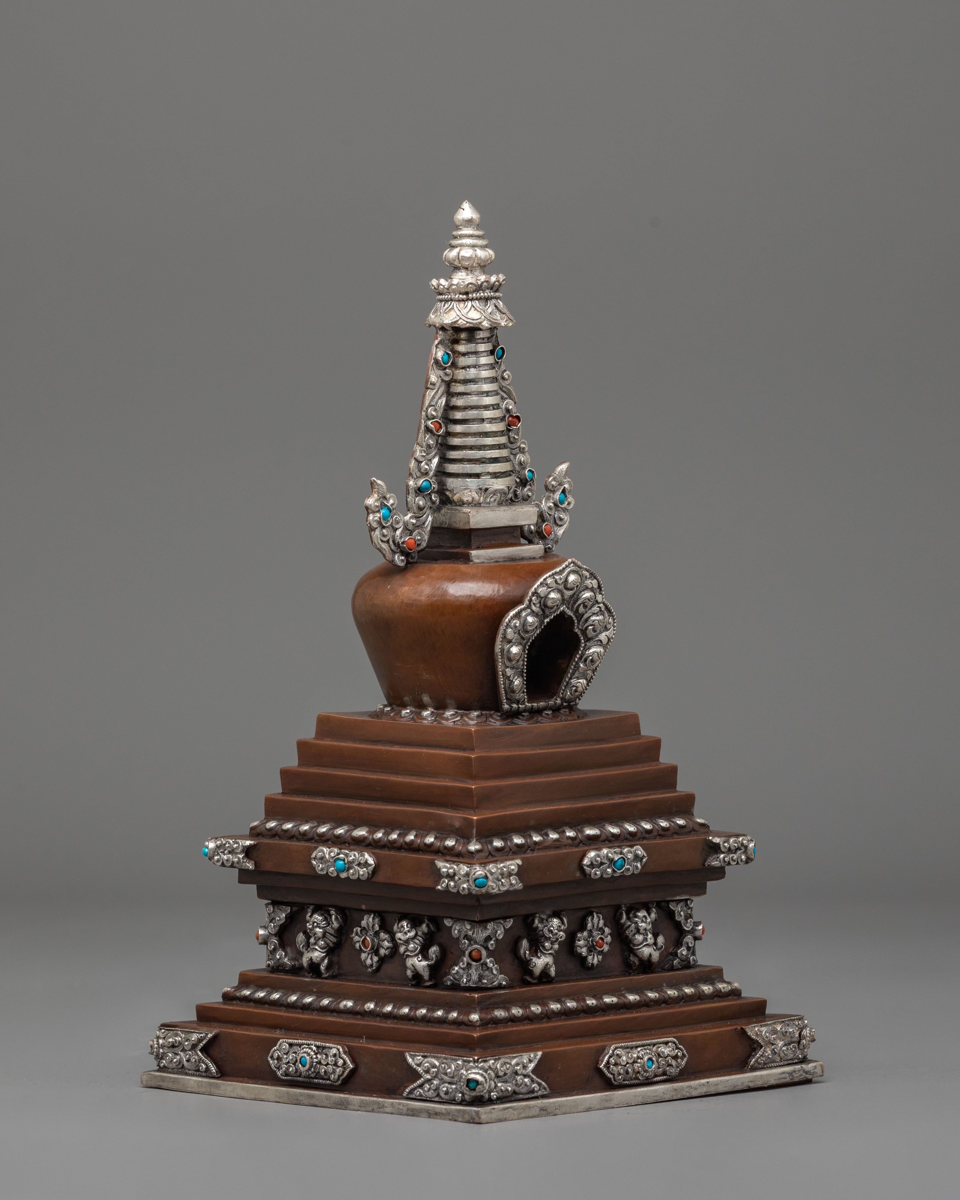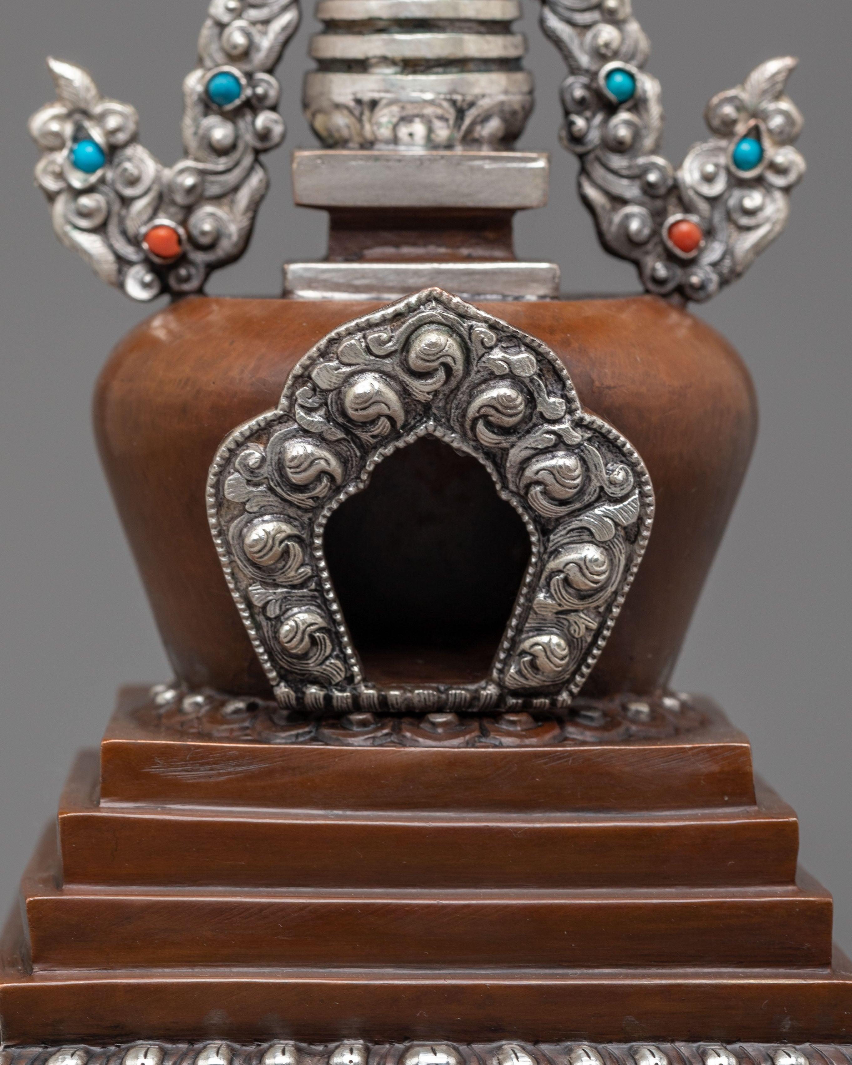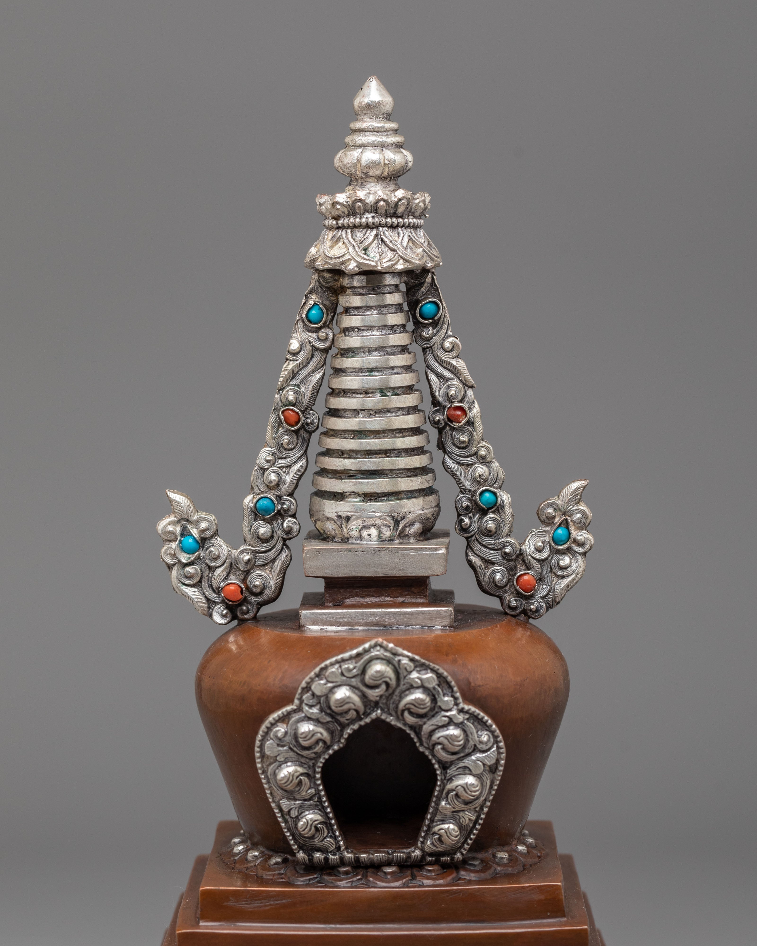 Every aspect of this Oxidized Copper Himalayan Ritual Stupa is imbued with spiritual meaning and expert craftsmanship. The square base symbolizes solidity and the physical world, whilst the dome represents the universe. The spire, which rises upward, represents the connection between human consciousness and enlightenment. The silver-plated accents and turquoise and coral stones highlight its mystical presence, boosting its spiritual vitality. The delicate carvings reveal the passion, expertise, and spiritual depth of traditional Himalayan artists, creating a sculpture that is both beautiful and meaningful.