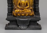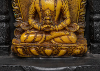 This exquisite Himalayan Sacred Amitayus Buddha statue embodies spiritual transcendence and timeless wisdom. Crafted with meticulous artistry, the deity sits in serene meditation upon a lotus throne, adorned in flowing robes and finished in luminous golden yellow a sacred hue symbolizing enlightenment and mental clarity. The figure's hands rest in a traditional mudra, representing profound spiritual communion. An ornate arch frames the deity, intricately carved with mythological patterns and crowned by the protective Garuda, a powerful symbol of strength and divine victory in Tibetan Buddhist tradition. This masterpiece transforms any space into a sanctuary of peace, inviting contemplation and spiritual connection while celebrating the rich heritage of Himalayan sacred art.