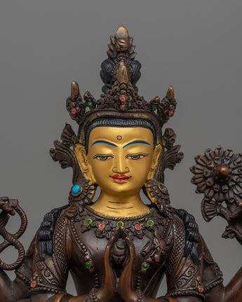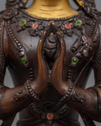 This Himalayan Sacred Deity Chenresig Statue, known as the embodiment of boundless compassion, represents boundless love, peace, and the desire to alleviate the suffering of all beings. This handcrafted statue is 10" (Height) x 7.1" (Base) and weighs 2.17 kg. It is made of oxidized copper, adorned with gemstones, and enhanced with detailed gold and acrylic paints. This sculpture, created by expert Nepalese artisans, symbolizes the spiritual traditions of Himalayan Buddhism and makes a meaningful addition to altars, meditation places, or sacred collections.