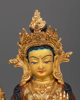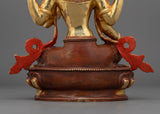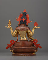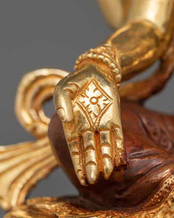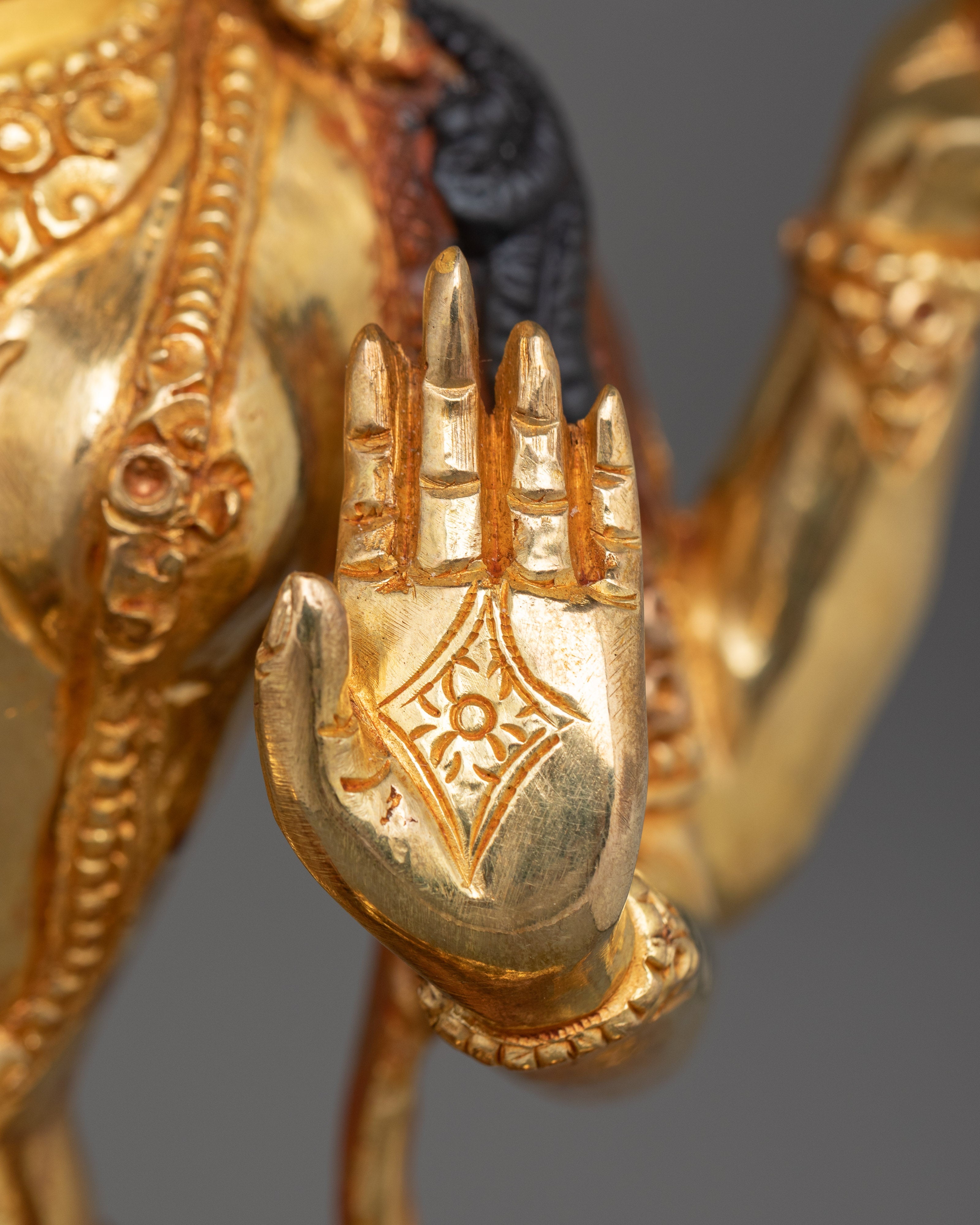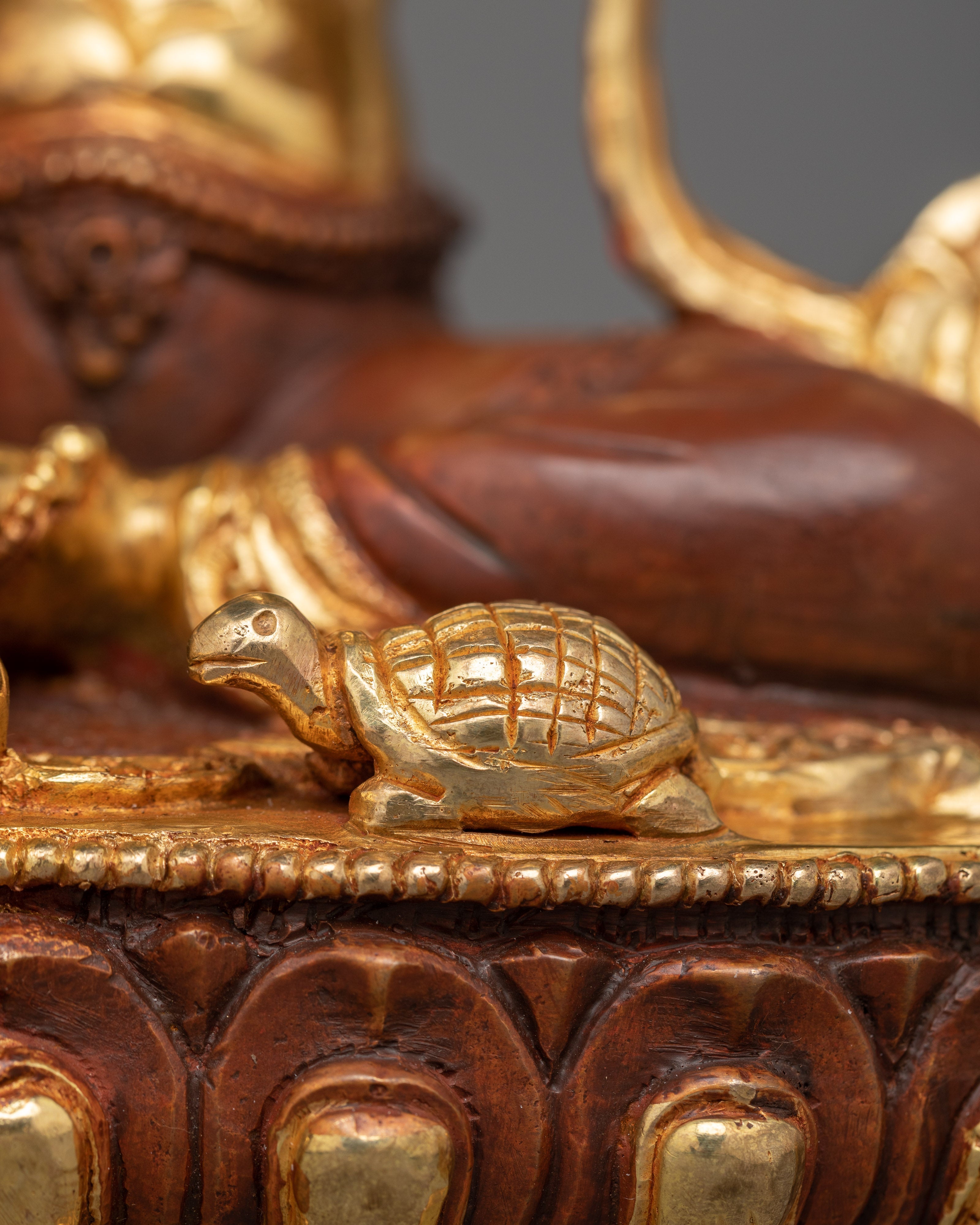 Our skilled artisans from Patan, Nepal, have crafted a handmade Hindu Wealth deity, the Laxmi Goddess Statue, in the traditional Himalayan style. In the statue, the god is depicted seated atop a lotus seat. She is portrayed with a single face, four arms, and a pair of legs. Her primary right hand is in Abhaya mudra, while her left is in Vitarka mudra. Her other two hands hold sacred ritual items. They have molded the statue using copper. Then, the long-hand carving on the figurine is completed using a hammer and chisel. Only an expert artist can hand-carve such intricate design patterns. They also decorated the deity with multiple body ornaments, including crowns, necklaces, bracelets, and anklets.