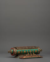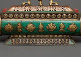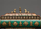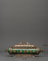 Designed to enhance your prayers and meditations, the guardian lions represent strength, protection, and courage, making this incense burner essential for everyone practicing Tibetan Buddhism or appreciating sacred rituals. The turquoise provides a touch of elegance, representing peace and innocence. The Buddhist symbols added to decorate the gorgeous cover contribute to the spiritual spirit surrounding you. This one-of-a-kind artwork is ideal for burning incense during meditation and prayer or to create a serene environment in your house.