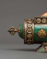 This Tibetan Incense Burner is a beautifully crafted spiritual item, standing 13 cm tall and 33 cm wide, made of copper, and adorned with turquoise. The guardian lions above the burner serve as protectors, ensuring safety and a positive energy flow in your home and meditation area. With its rich symbolism and creative craftsmanship, this incense burner is practical and a work of art that will enhance any altar, meditation space, or sacred location.