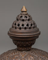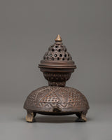 The top lidded compartment is used for burning incense sticks or cones, with fragrant smoke gradually flowing through the delicately holed dome. Aside from its practical use, this burner is also a visually appealing ornamental component. It is a timeless combination of symbolism and workmanship that would make an ideal gift for Eastern philosophy and mindfulness practitioners.
