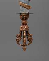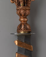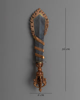 In Buddhist iconography, the Intricate Manjushree Sword is highly esteemed as a sign of knowledge and clarity. This sword, which is made of iron and copper, represents the insight that pierces ignorance and delusion. Its elaborate design, which is emphasized by traditional Tibetan patterns, exhibits both artistic mastery and spiritual profundity. The shape of the blade represents Manjushree's function as the Bodhisattva of Wisdom, slicing through barriers to unveil enlightenment and ultimate truth.