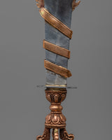 Ritual tools are vital equipment of Tibetan Vajrayana Buddhism practice, meant to dispel misconceptions that obstruct enlightenment. The phurba (Sanskrit: Kila) blade seen here was created to symbolically swallow the three poisons that obstruct spiritual progress: ignorance, greed, and illusion. The Phurba is the physical manifestation of the Vajrakila Buddha, who has the ability to destroy all evil on the earth. Its ceremonial usage is first recorded in the Vajrakilaya Tantra, an eighth-century or older Vajrayana work.