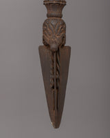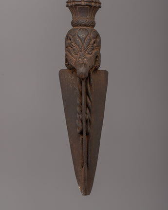 This massive ceremonial artifact, measuring 41 cm in width and 11 cm in height and weighing 2.848 kg, is decorated with exquisite carvings and sacred symbols that add to its spiritual value. The triple-edged blade symbolizes eliminating ignorance, attachment, and dislike, making it an effective tool in Tibetan rituals. Whether placed in a sacred area or temple or for spiritual protection, this iron Phurba is a potent symbol of transformation and divine guidance.