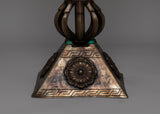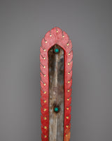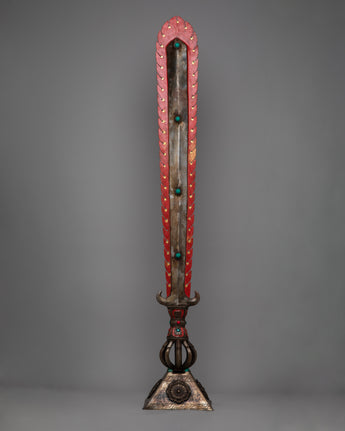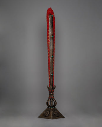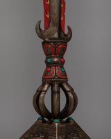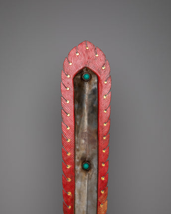 Ritual tools are vital equipment of Tibetan Vajrayana Buddhism practice, meant to dispel misconceptions that obstruct enlightenment. The phurba (Sanskrit: Kila) blade seen here was created to symbolically swallow the three poisons that obstruct spiritual progress: ignorance, greed, and illusion. The Phurba is the physical manifestation of the Vajrakila Buddha, who has the ability to destroy all evil on the earth. Its ceremonial usage is first recorded in the Vajrakilaya Tantra, an eighth-century or older Vajrayana work.
