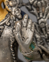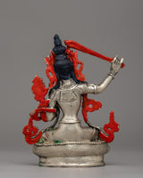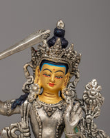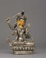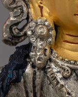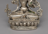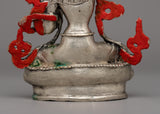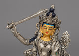 The statue's brilliant finish, handcrafted from a copper body and embellished with electro-silver plating, highlights its exquisite beauty. Acrylic paint adds brightness to the complex features, such as the deity's crown, jewels, and lotus foundation symbols. Weighing only 0.54 kg, this lightweight yet robust statue is ideal for personal altars, spiritual places, or as a thoughtful gift. Its ageless workmanship assures that it will be valued as a symbol of enlightenment and wisdom for many years to come.
