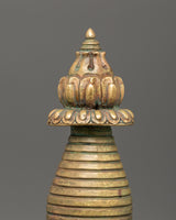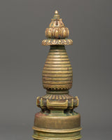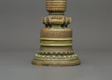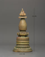 This handcrafted copper stupa weighs 1.09kg and features elaborate embellishments that show the talent and dedication of experienced workers. The stupa, a sacred Buddhist relic, is thought to emit positive energy, remove negative karma, and foster serenity and spiritual transformation. Whether on a personal altar, temple, or meditation room, this stupa provides a powerful focal point for prayers and sacrifices.
