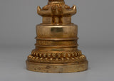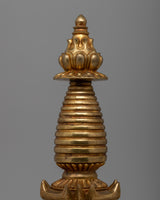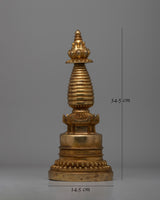 The Traditional Kadampa Buddhist Stupa is a stunning sculpture made of pure copper and gilded with dazzling gold. This stupa is both a physical and spiritual miracle, standing at 34.5 cm tall, 14.5 cm wide, and weighing 2.30 kg. The glittering gold finish emphasizes its heavenly essence, representing purity, enlightenment, and the timeless character of Buddha's teachings. It is revered for its spiritual significance and serves as the focal point of Buddhist meditation, ceremonies, and devotion, symbolizing the profound principles of wisdom and compassion.