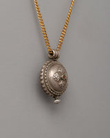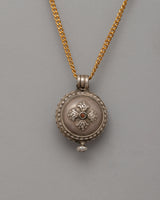The front of this locket is delicately carved with the Kalachakra mantra, which represents the Wheel of Time, a powerful Buddhist symbol of the universe's cyclical cycle and the path to enlightenment. This mantra is encased in a beautiful circular pattern, representing spiritual harmony and cosmic equilibrium. The locket is intended to carry little spiritual artifacts, such as relics or mantras, emphasizing its importance. This Buddhist Ghau locket, whether worn as a protective talisman or as a meaningful adornment, is both spiritually profound and visually magnificent.