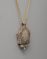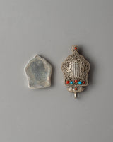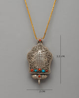 This Kalachakra Mantra Ghau Prayer Box Locket is crafted with amazing workmanship and measures 5.5cm in height and 3cm in width, weighing only 0.012kg. This sacred locket, crafted from excellent silver and adorned with coral and turquoise stones, combines beauty with spiritual importance. The Ghau Box has long been seen as a symbol of longevity, success, and protection, with mantras or sacred relics used to enhance its spiritual power. This prayer box, known for attracting positive energy and repelling evil spirits, functions as a spiritual amulet and a beautiful piece of Buddhist jewelry. Whether worn near the heart or displayed in a shrine, it enhances one's spiritual practice and connection to higher forces.