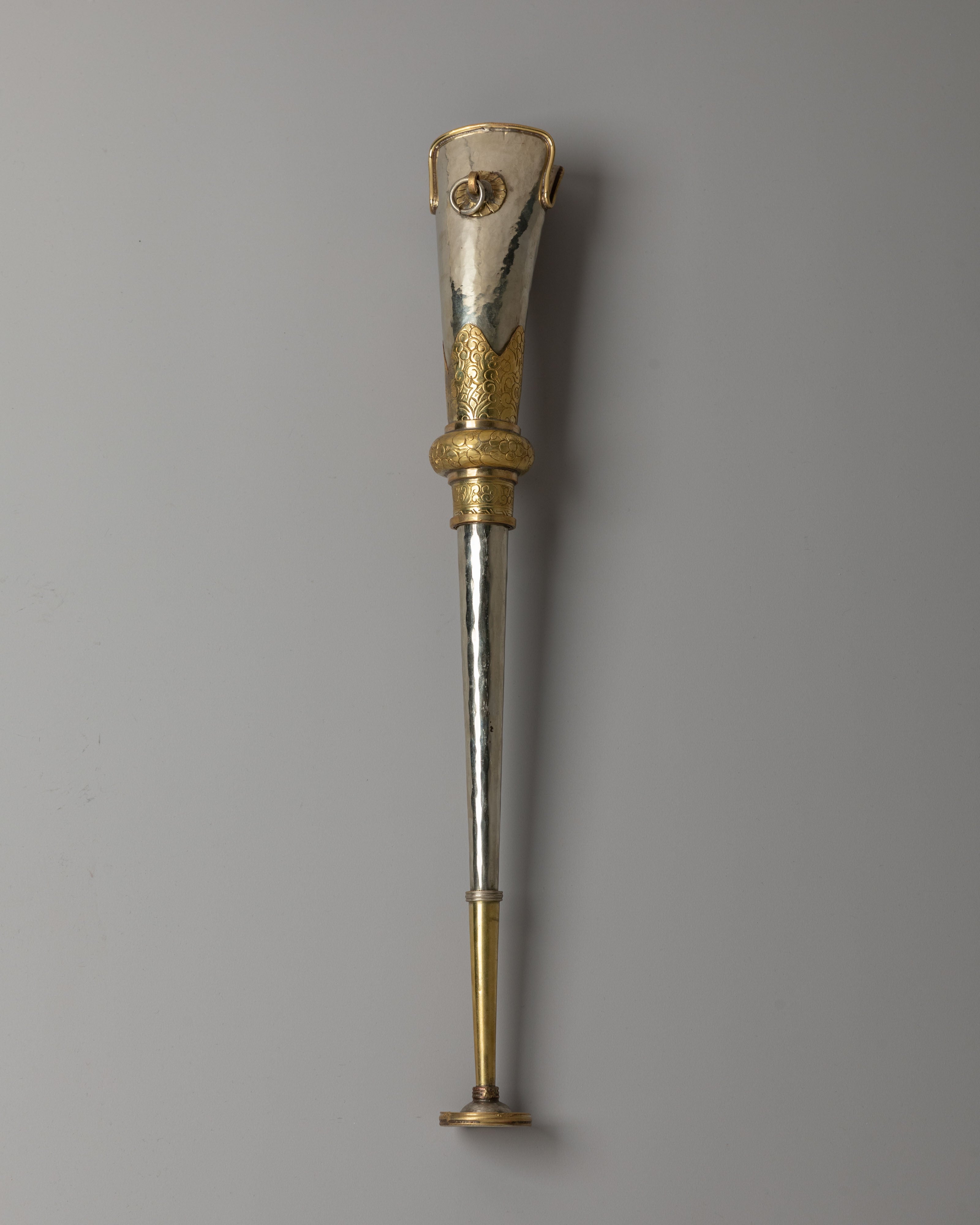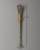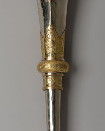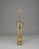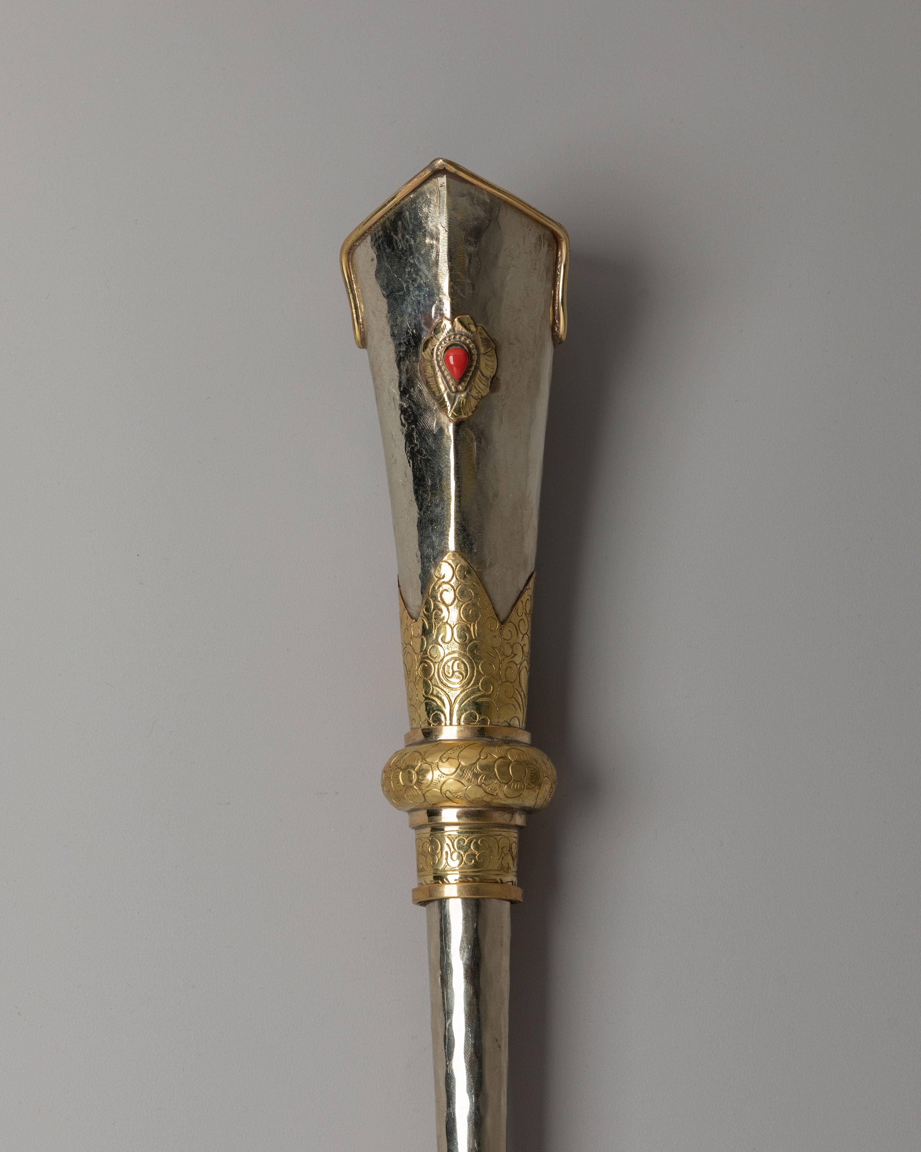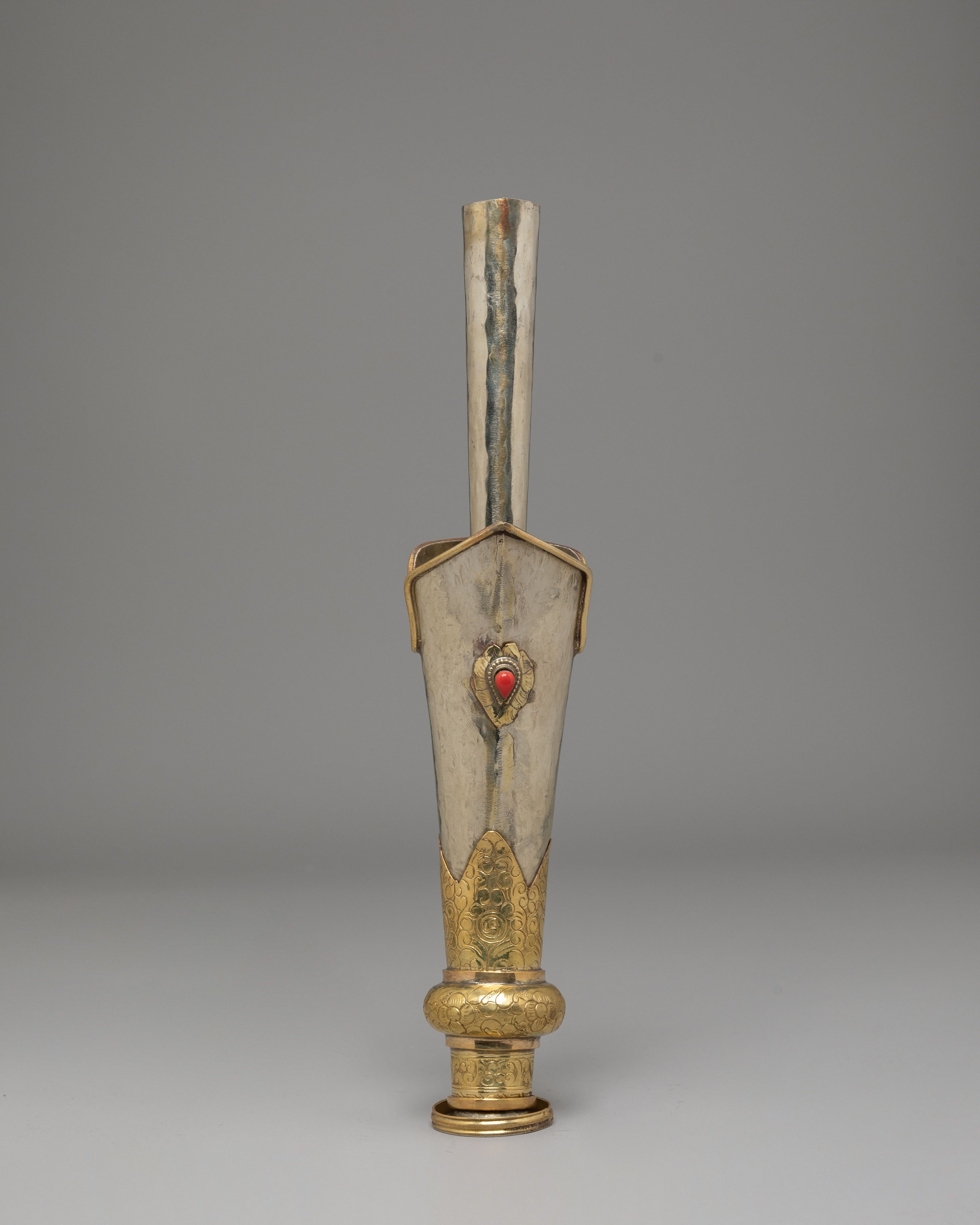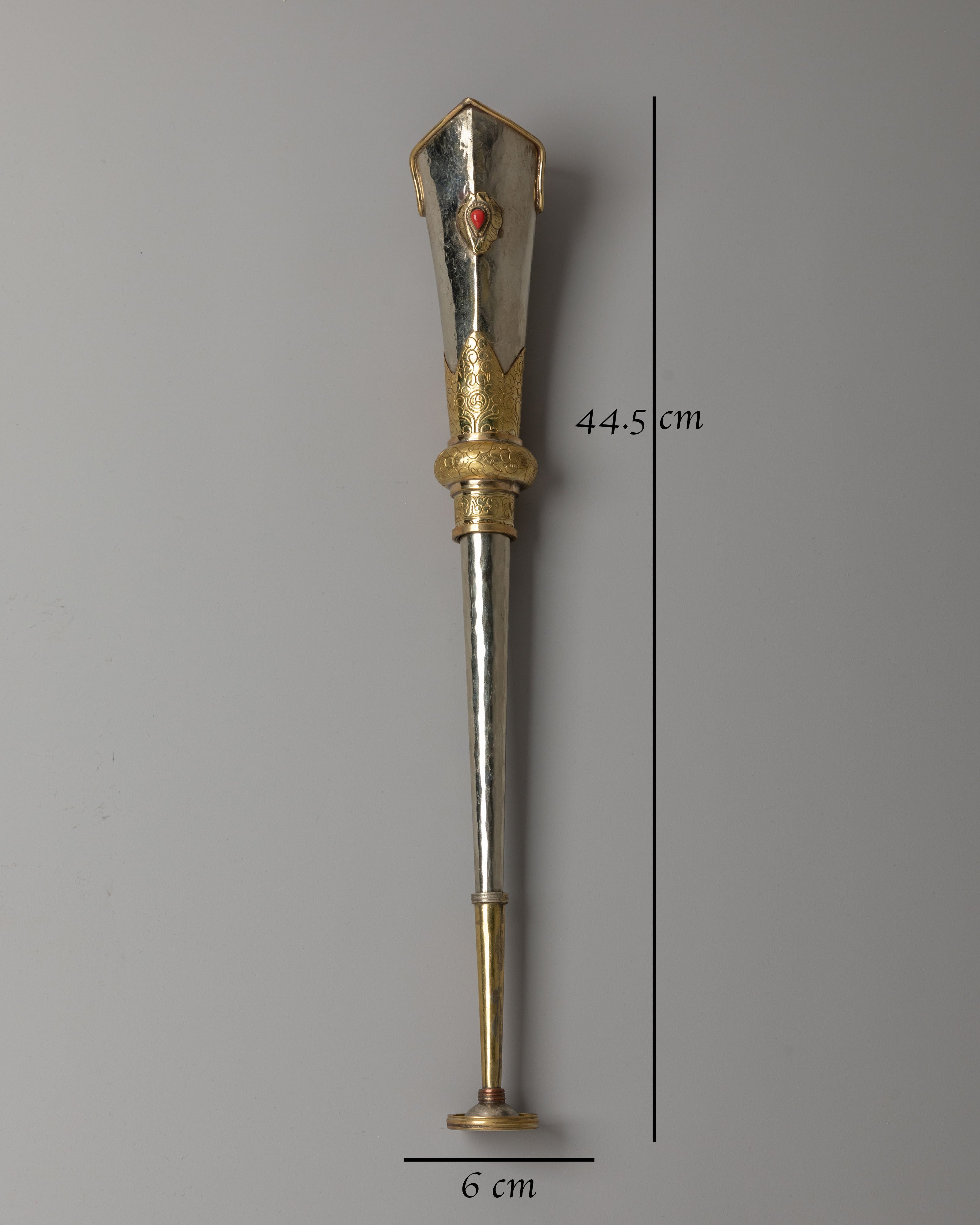 This Kangling is a traditional Tibetan ritual instrument used in sacred practices, spiritual invocations, and meditative offerings. Measuring 44.5 cm in height and 6 cm in width, this elegant ritual trumpet is crafted from white metal with a gold-plated finish and adorned with a single coral stone. In Tibetan Buddhist ceremonies, the Kangling is played to summon protective deities, dispel negative energies, and support profound spiritual transformation, making it an essential tool for practitioners and ritual specialists.