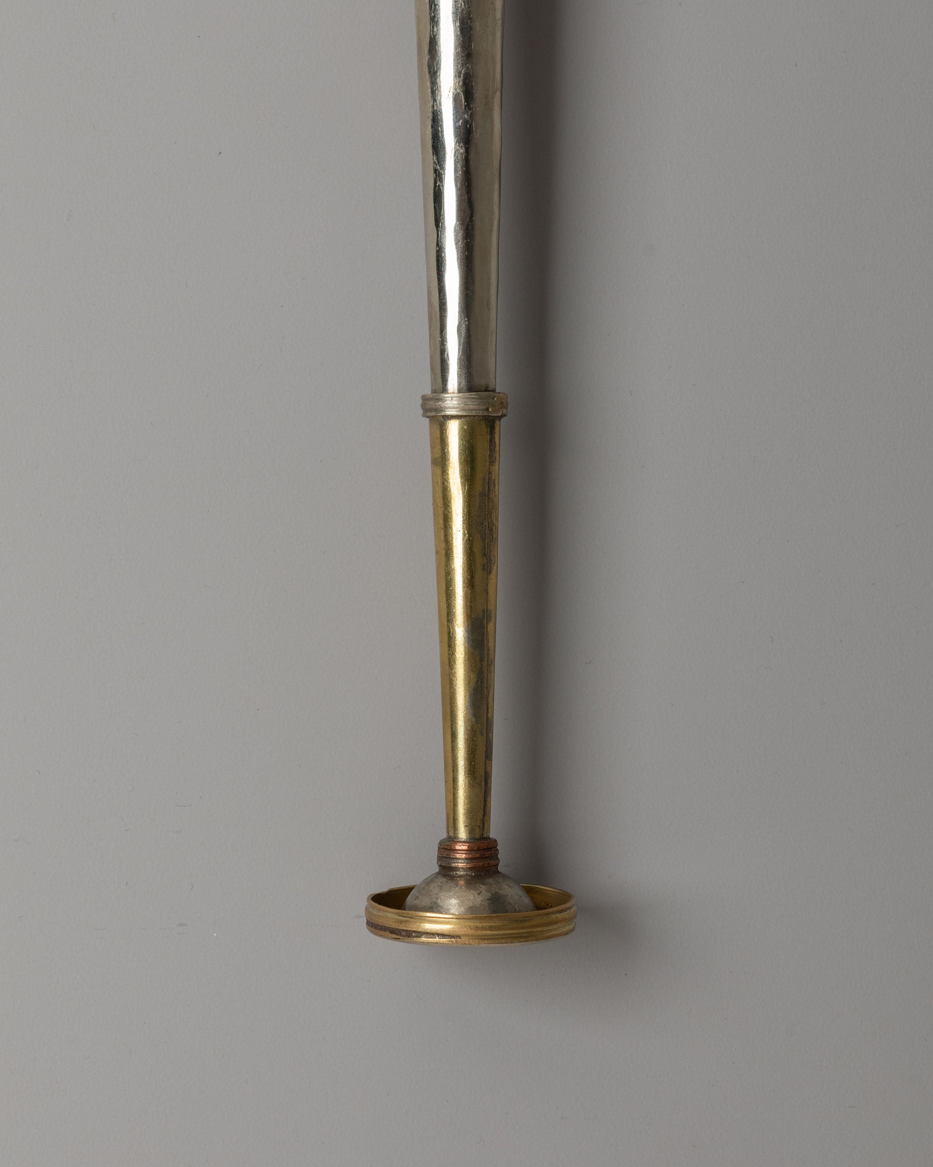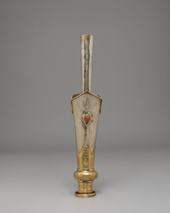 The design of this Kangling blends simplicity with symbolic detail. The upper section features gold-plated motifs that highlight traditional Himalayan craftsmanship, while the elongated white metal body creates a clear, resonant tone when played. Near the top, a striking coral stone sits embedded in a lotus-style frame, symbolizing vitality, compassion, and sacred offering. The tapered form of the instrument supports its ritual function, allowing the sound to project with intention and clarity during ceremonies.
