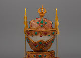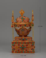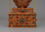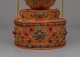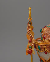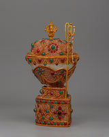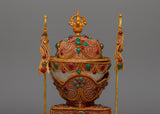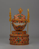 This Kapala Dharma Decor, 22 cm in height and 11.5 cm in width weighs 0.714 kg and demonstrates amazing artistry and spiritual craftsmanship. The copper body is delicately silver plated, resulting in a smooth, reflective surface showcasing the intricate design features. The base is decorated with filigree details that create a sense of sublime grace and accuracy in Tibetan art. These decorations embellish the piece and increase its spiritual presence, making it ideal for meditation or ceremonial practices.