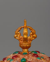 The Half Vajra at the top boosts the Kapala's general spiritual energy, encouraging clarity and connection to the divine. Two exquisite handles at the top complete the design, lending balance and symmetry to the item. These materials combine to display sacred creativity, representing knowledge, transformation, and the interconnection of life and death, central concepts in Tibetan Buddhism. This Kapala is a utilitarian, ceremonial tool and a stunning decorative piece with profound spiritual meaning and importance.