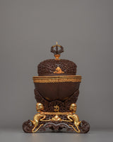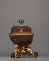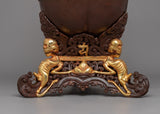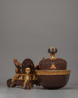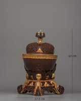 This Kapala is traditionally used in Tibetan Buddhist rituals to represent the offering of wisdom and spiritual transformation. The gold-plated accents and the exquisite color detailing emphasize this object's sacred nature, representing the union of spiritual power and beauty. As a significant and striking ritual object, this Kapala serves as both a functional offering piece and a decorative piece that adds to the spiritual ambiance of any space. The Kapala's presence is powerful, acting as a functional and symbolic reminder of Tibetan Buddhist traditions.