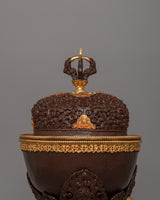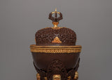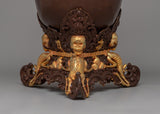 The Kapala's foundation is solid and ornate, with sculpted figures and symbolic motifs typical of Tibetan religious art. The body of the Kapala is elegantly detailed with flowing, intricate designs that combine geometric patterns and natural elements, creating a sense of spiritual harmony. The electro-gold plating elevates the design, transforming it from a functional ritual object to an exceptional piece of art that would stand out in any collection or altar.