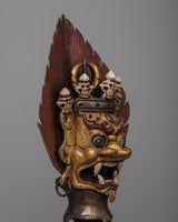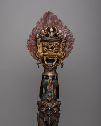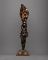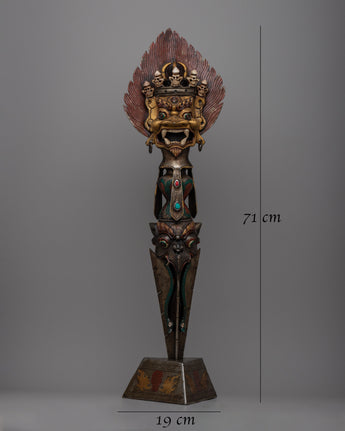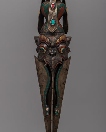 With a height of 71cm, the Iron Kila Dagger emits a commanding presence, representing the ability to overcome difficulties and defeat inner and exterior foes. Its three-sided peg-shaped blade depicts the subjugation of bad energies, while the delicate features and colors painted on the grip and blade deepen its spiritual meaning.