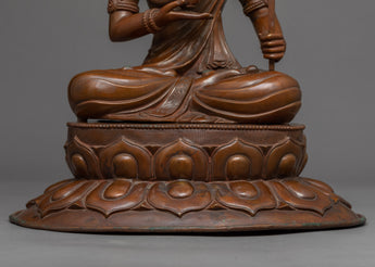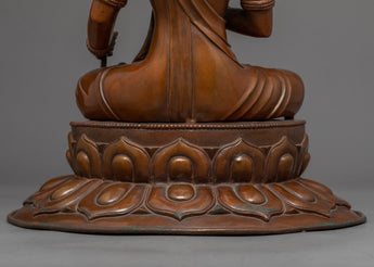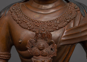 We have crafted a magnificent Kshitigarbha Bodhisattva sculpture in the traditional Himalayan style. Our skilled artisan has sculpted this masterpiece with a pure copper body giving it a timeless elegance. The Bodhisattva sits regally on a lotus throne, draped in glorious Kasaya robes, holding a staff with left hand. An antique painting technique has been utilized to further enhance its uniqueness, resulting in a truly exceptional work of art.