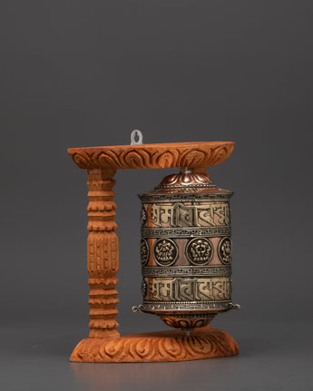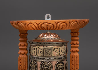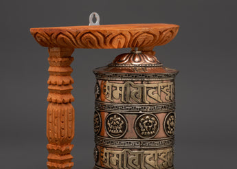 This large, handcrafted prayer wheel, crafted from copper and brass, is a holy item of profound significance in Tibetan Buddhist traditions that can elevate your spiritual practice. With its elaborately engraved mantras and carved wooden frame measuring 18cm in width and 21cm in height, this prayer wheel exudes both visual beauty and strong spiritual force.