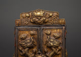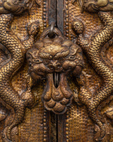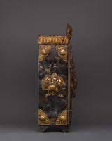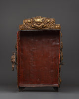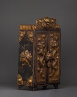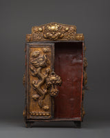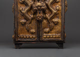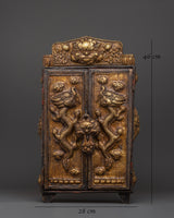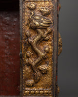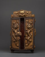 This large Tibetan Ghau Box is a strong, sacred storage shrine designed to protect and enshrine your most significant spiritual objects. Standing 46 cm tall and handcrafted from brass and iron, it has double front doors covered with stunning dragon relief carvings, which in Tibetan iconography represent protection, strength, and divine guardianship.