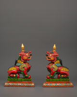 Tibetan Snow Lion Statue Set | Hand-Carved Wooden Guardian Figures for Protection