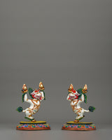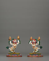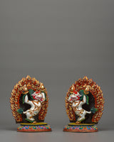 Foo Dog Lion Set is skillfully handcrafted from high-quality copper and embellished with intricate acrylic accents. Buddhist and Feng Shui traditions respect these spiritual guardian lions as great protectors representing strength, courage, and heavenly energy. Their strong emotions and energetic postures represent a sacred energy that repels harmful energies and protects your temple or shrine.