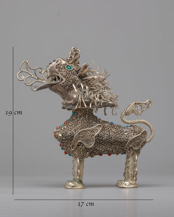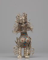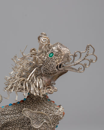 We are pleased to present our magnificent Copper Lion Statues, which are expertly made on copper bodies and finished with electro silver plating. These majestic statues radiate power and grace, serving as guardians and symbols of bravery in every area they adorn. Each lion statue is adorned with inlaid imitation turquoise and coral stones, which give them a lively and luxurious appearance that elevates their majestic demeanor.