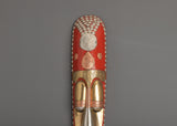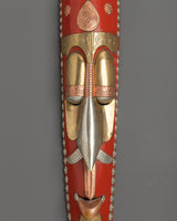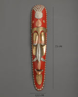 The outstanding woodwork and bold design, featuring metallic accents and a striking, elongated face, reflect excellent craftsmanship. The vibrant colors highlight the mask's profound and timeless significance. This unique wall décor piece will bring a touch of tribal elegance to your home, meditation space, or art collection, while also offering visual appeal and cultural significance.