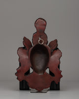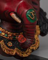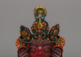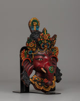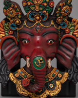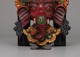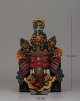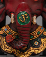 This mask is more than just a spiritual representation; it is a masterpiece of craftsmanship. Two decorative stands flank Ganesh's head, each with flowing designs that add movement and energy to the overall structure. The intricate floral carvings on the crown emphasize the artistry and attention to detail in its creation. The use of artificial turquoise and coral stones adds to the visual appeal, creating a sense of richness and vibrancy. The deep red coloration represents Ganesh's auspicious and benevolent nature. This mask is more than just a decorative piece; it is a powerful spiritual symbol that is said to bring blessings and positive energy into any environment.