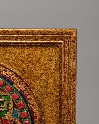 The Lord Ganesha wall hanging features the god seated on a throne, adorned with intricate patterns and divine symbols rich in spiritual meaning. Lord Ganesha’s four arms each hold symbolic objects: a sweet, a lotus, a mala, and a broken tusk, each representing different aspects of life and spiritual growth. The stone-dust epoxy adds texture to the detailed designs, bringing the vibrant colors and gold-plated accents to life and making this piece a striking focal point for any room. The wooden back ensures the piece’s structural integrity, allowing it to be easily hung while providing a traditional aesthetic.