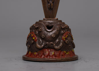 This phurba, which comes with a custom-made stand, is both a gorgeous decorative item and a useful tool. The stand enhances its aesthetic appeal, guaranteeing that it can be boldly presented in any spiritual context. Mahakala's appearance indicates the deity's ability to dispel illusions and shield followers on the path of spiritual development. With its intricate design and profound meaning, this handcrafted phurba is a priceless addition to any altar, meditation space, or collection of holy objects.