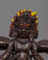 The Mahakala Phurba with Stand is an exquisite work of spiritual art fashioned by hand from copper. In the Buddhist tradition, this 28-cm-tall phurba is used as a ritual implement and a potent symbol of protection. The highly carved image of Mahakala at the top represents the powerful, defensive qualities that fend off evil spirits and impediments, while the oxidized copper body gives the sculpture an aged, mysterious appearance.