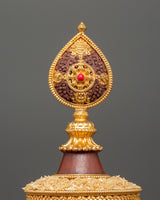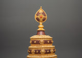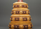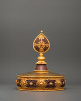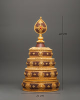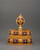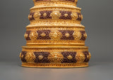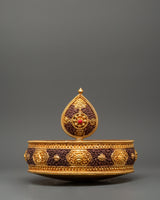 The Mandala Ritual Offering is a beautifully crafted spiritual instrument for meditation, ceremonies, and rituals. This offering piece, which stands 40 cm tall with a 21 cm base, is made from copper and features gold plating, providing stunning visual appeal. The exquisite gold finish enhances the offering experience by adding a touch of richness and reverence to the spiritual ceremony. Weighing 1.78 kg, it brings significant presence and balance to your sacred space.