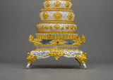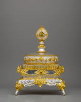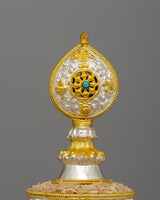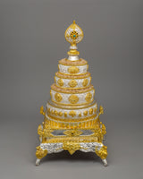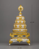 The Mandala Tibetan Set is a handcrafted masterpiece combining traditional symbolism and creative elegance. This set is 42cm tall and 22cm broad and includes a 15cm mandala centerpiece. It is made of sturdy copper and finished with dazzling electrogold and silver plating layers. It emits divine energy, making it an excellent choice for Buddhist rituals, offerings, or as a focal point in meditation or altar settings.