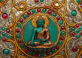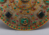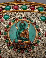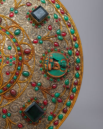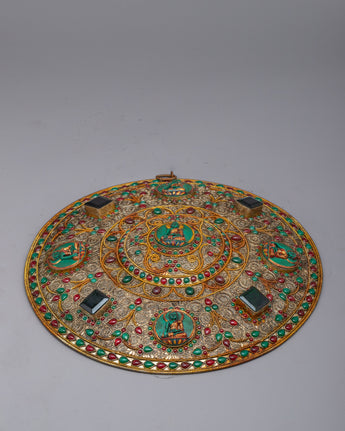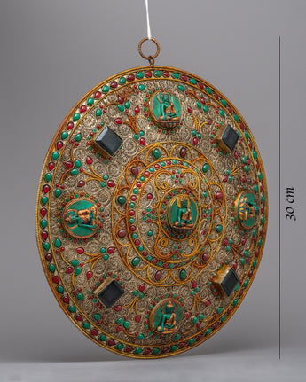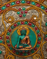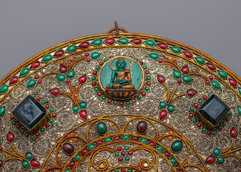 The Copper Mandala Wall Hanging is an exquisite work of art. It is handcrafted on a copper body and includes careful 24k gold and silver plating for a touch of elegance and sparkle. The intricate wire designs form a fascinating pattern that draws the eye to the middle, where a wonderfully carved deity sits. The combination of Copper and the skillful design elevates this wall hanging to the level of a true piece of art, ideal for giving a touch of spirituality and beauty to any area.