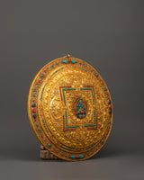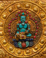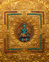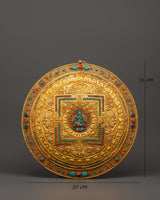 This sacred mandala, expertly carved by skilled Himalayan artisans, features Shakyamuni Buddha, the enlightened one, and would make an excellent centerpiece for meditation rooms, Buddhist altars, or spiritual home decor. The beautiful gemstone inlays boost its spiritual energy, offering any room a sense of calm, protection, and attentiveness. Whether employed as a meditation tool, ritual object, or artistic statement of Buddhist philosophy, this gold-plated mandala is a powerful emblem of spiritual connectedness and divine rewards.